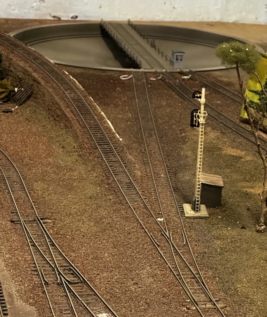 Turntable viewed from Allandale. The track entering on the right is from Glen Evans, the next track clockwise is Track 1 from Allandale followed by Track 4 From Allandale. Hidden behind the ramp are Tracks 1, 2 and 3 from Brisbane Yard. The ramp is Track 4 from Allandale leading to the Coal Stage at Brisbane Yard.